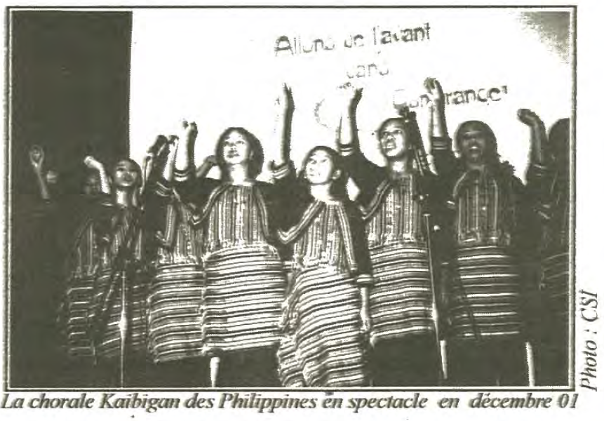 Ces jeunes filles de 10 à 17 ans, remplies de sourires et de vie, participent au programme de la Fondation Kaibigan, mot philippin qui signifie ami+. La Fondation, parrainée par les Œuvres du Cardinal Léger, les accueille et les aide à cheminer malgré la pauvreté. La chorale devient pour elles une façon honorable de gagner des sous tout en sensibilisant le public à la réalité des enfants défavorisés. Puisque des enfants sans famille et sans le sous, les Philippines en comptent plus qu’il n’en faut En effet, plus de 2 millions de personnes, principalement des enfants et des adolescents, vivent dans la rue. Manille, la capitale. en compte plus de 100 000 à elle seule. Pour survivre, ces enfants vendent des fleurs, des journaux.._ et parfois se vendent eux-mêmes. La Fondation Kaibigan leur offre de l’aide sous différentes formes : écoute, éducation, soins de santé préventifs et curatifs, en plus de fournir un lieu où ils peuvent créer et s’amuser. Ainsi, on y retrouve des classes de sport, d’art dramatique et de chant